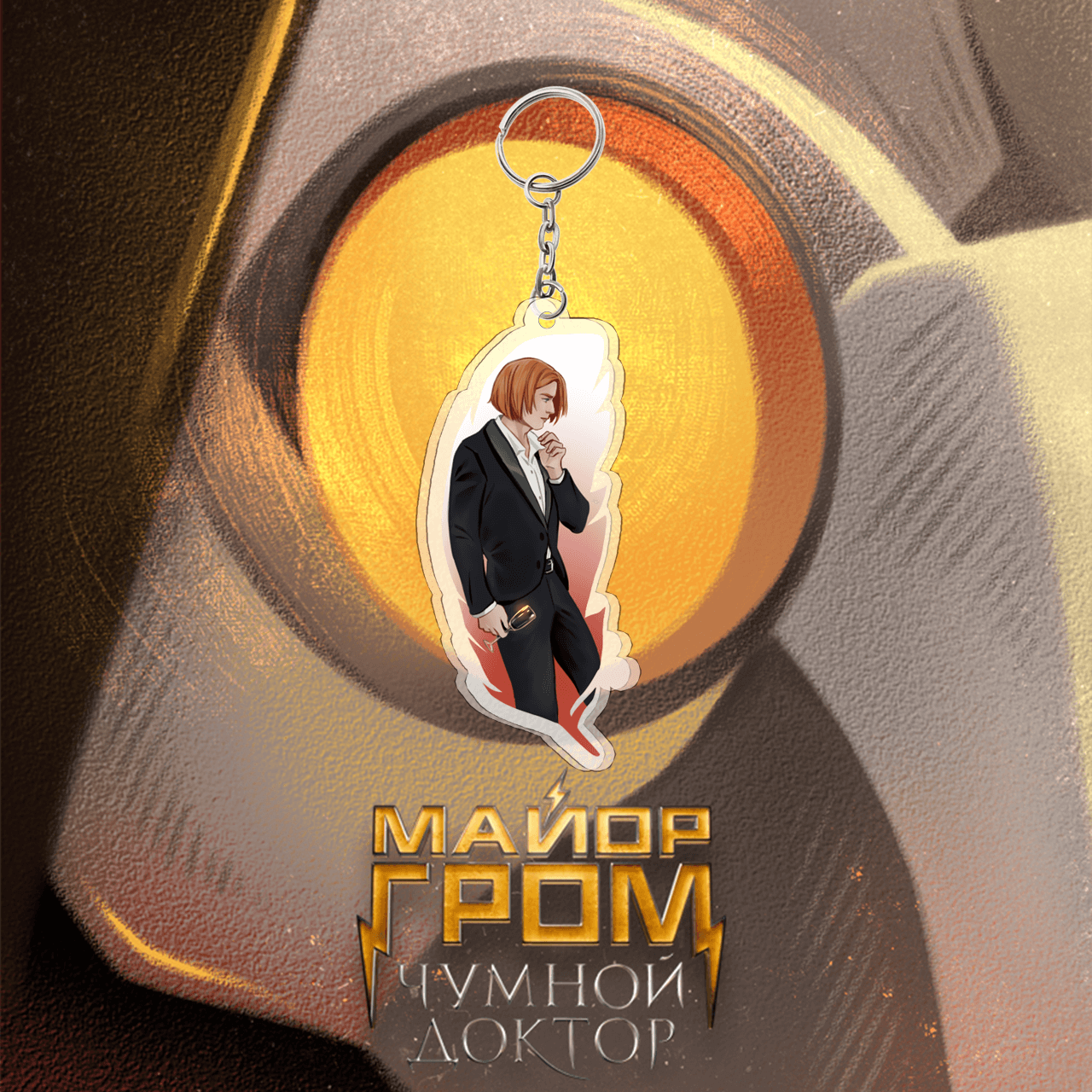 Двухсторонний акриловый брелок по фильму Майор Гром: Чумной Доктор с Сергеем Разумовским в двух образах, заключённых в перо.