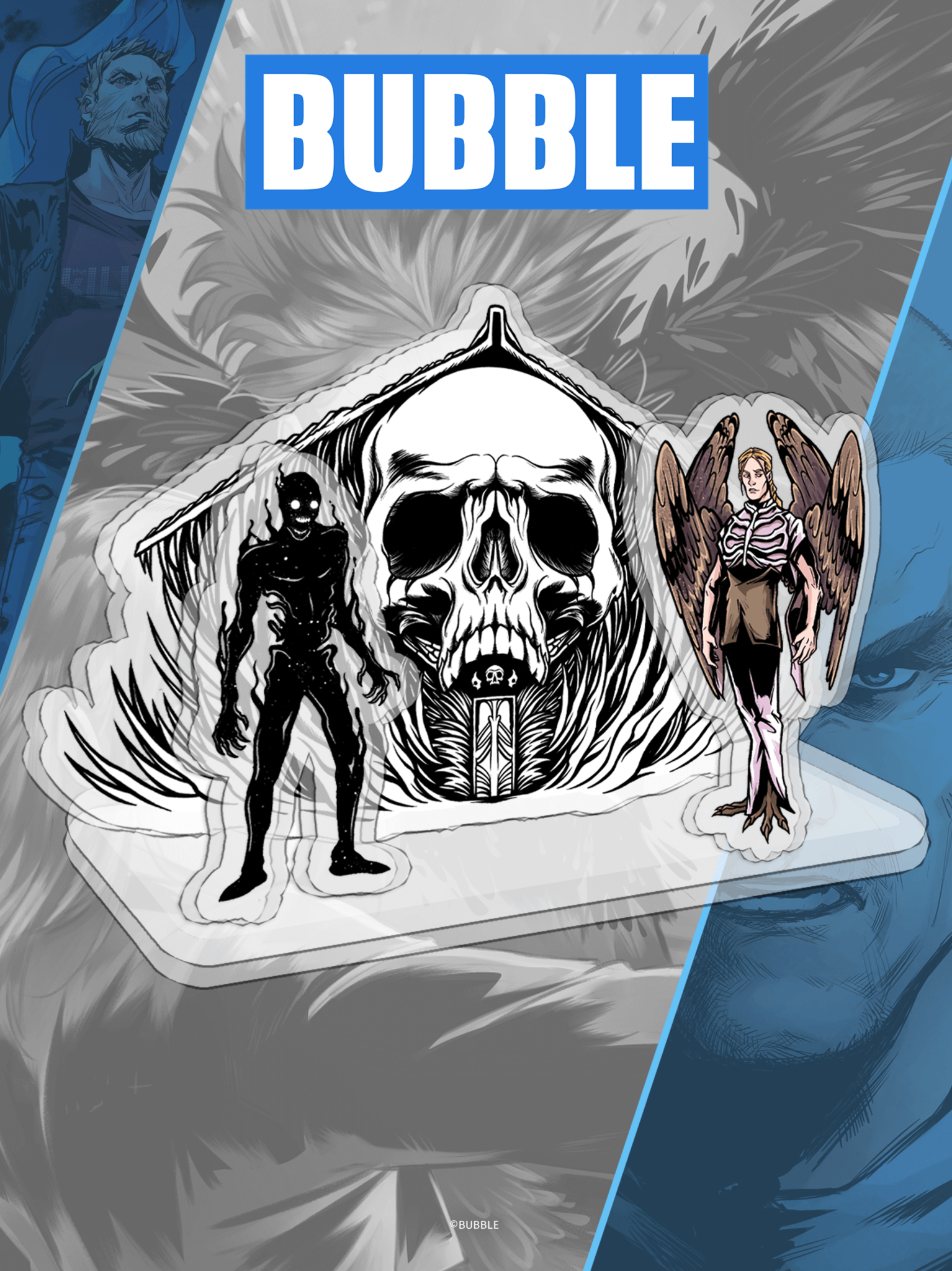Составной акриловый стенд по серии Экслибриум со зловещим Костяным домом и его привратниками: тенями и Соловьём.