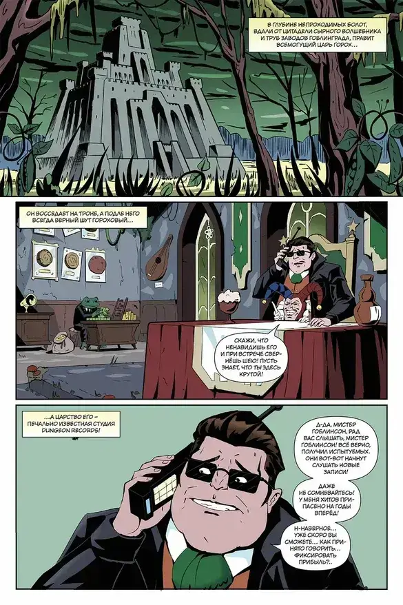 На самом деле всё несколько проще: Dungeon Records — это благотворительный проект уважаемого мистера Гоблинсона, благодетеля всея Гоблинграда, направленный на улучшение музыкального вкуса подрастающего поколения. Лейблом действительно заправляет Горох… вот только царём его никто не называет: это байкер-неудачник, отбившийся от банды «Лунных волков», который после страшной аварии слился в единое целое со своим лучшим другом…