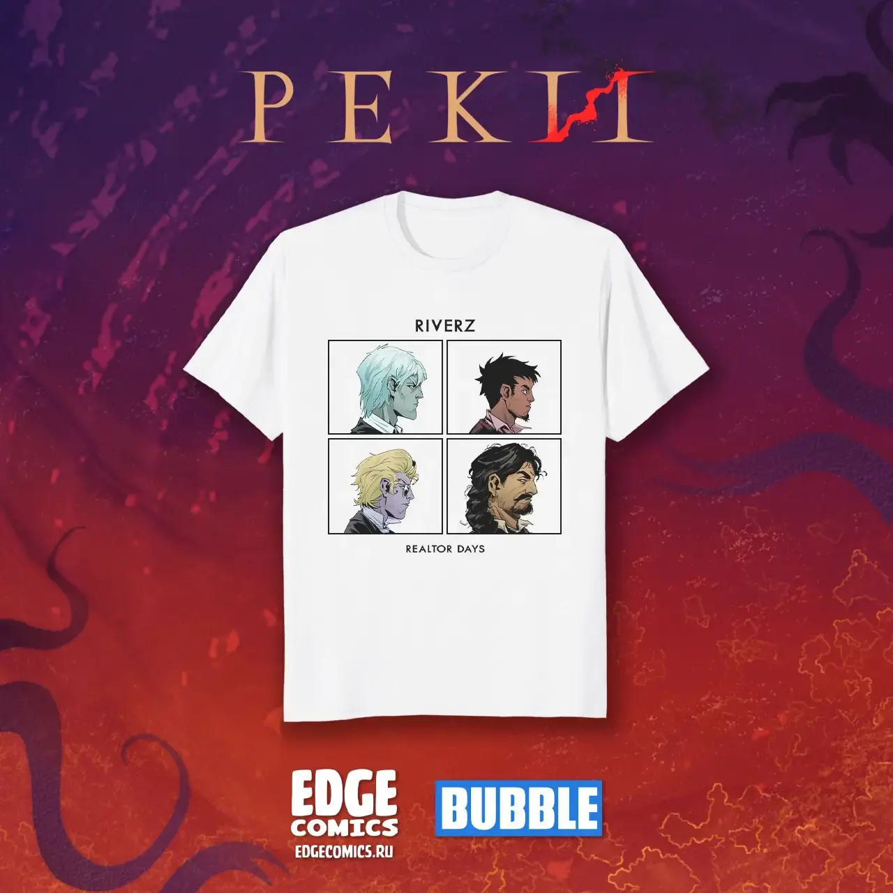 Футболка с зажигательным оммажем с четвёркой Рек: Riverz - Realtor Days. Речная братия в их классических образах чёрных риелторов явно что-то замышляет. Эксклюзивный белый вариант, доступен только в рамках крауда.