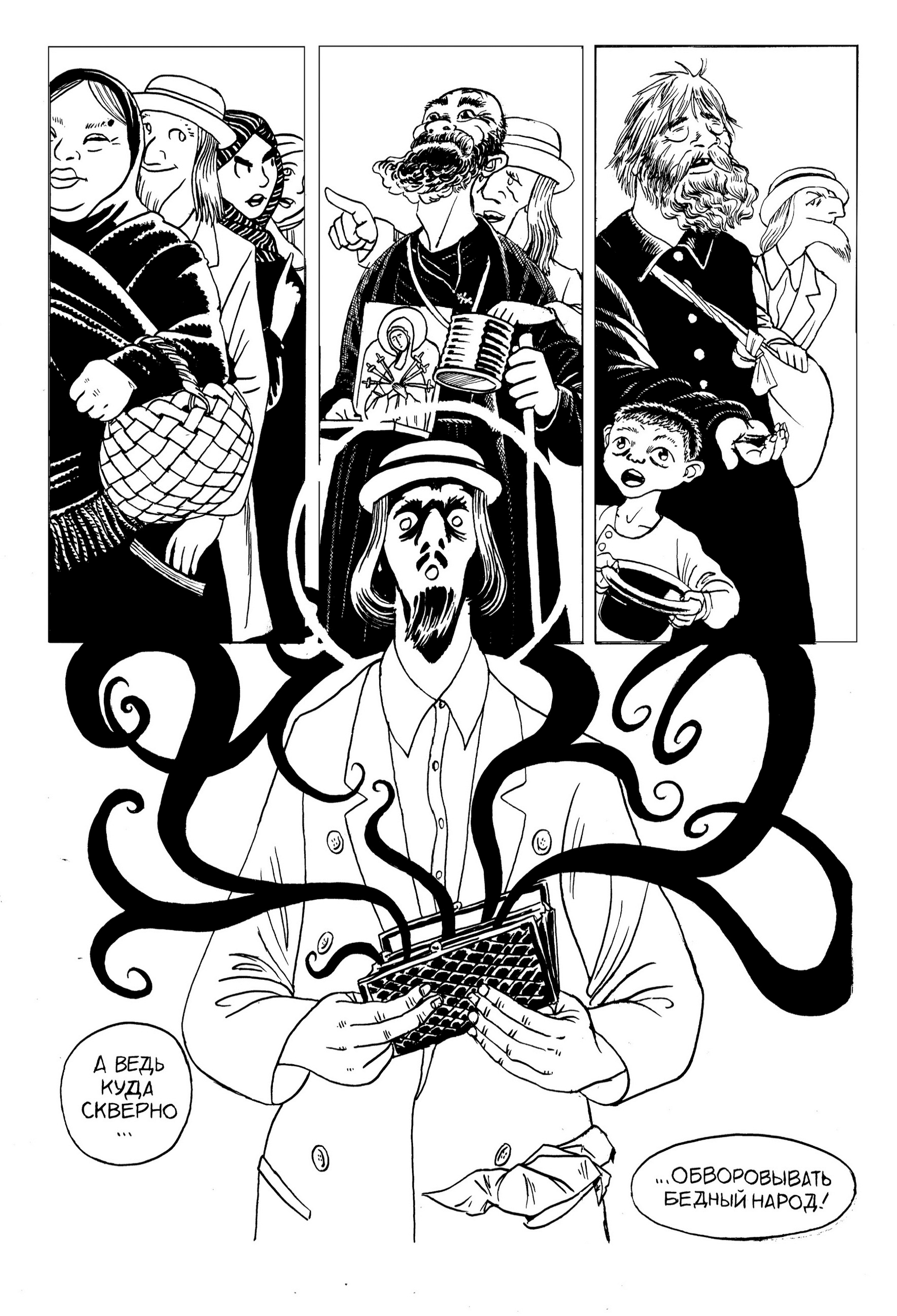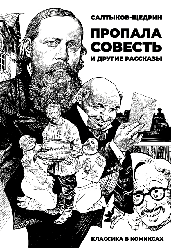 Михаил Салтыков-Щедрин — признанный классик русской литературы, выдающийся сатирик и непревзойдённый мастер малой формы. Данное издание приурочено к 200-летию великого писателя и объединяет графические адаптации трёх его знаковых произведений: «Повесть о том, как один мужик двух генералов прокормил», «Обманщик-газетчик и легковерный читатель», «Пропала совесть». В этих историях автор с беспощадной иронией говорит о паразитировании на труде простого человека, о манипуляции сознанием через слово, о мире, в котором совесть становится лишней.