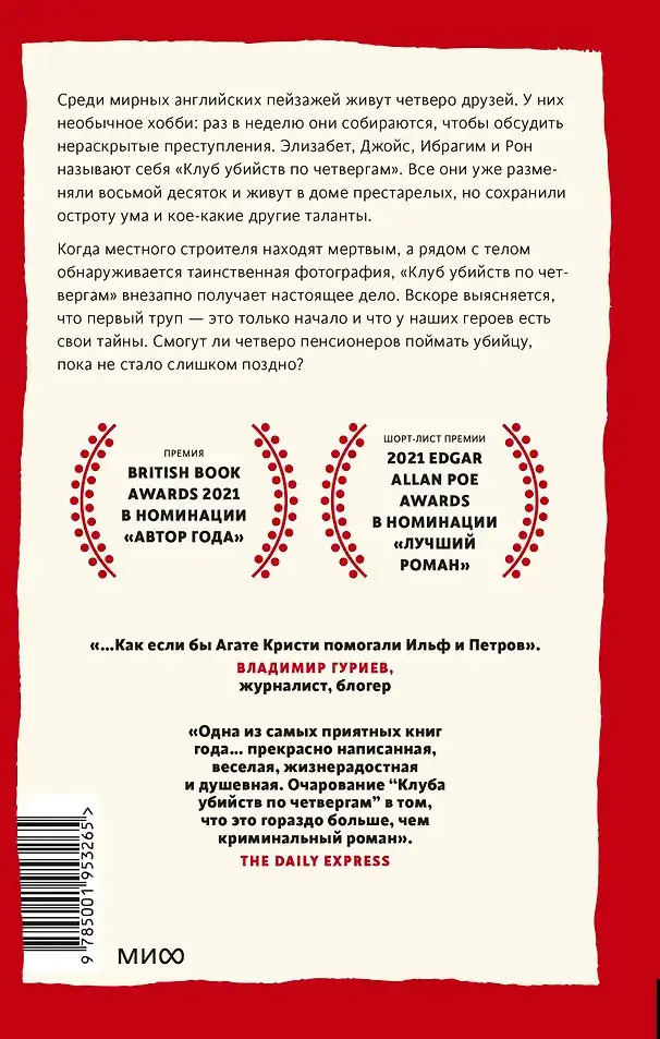 В доме престарелых, расположенном среди мирных сельских пейзажей, четверо друзей еженедельно встречаются в комнате для отдыха, чтобы обсудить нераскрытые преступления. Они называют себя Клубом убийств по четвергам. Элизабет, Джойс, Ибрагим и Рон уже разменяли восьмой десяток, но у них все еще есть кое-какие трюки в запасе. Когда местного строителя находят мертвым, а рядом с телом обнаруживается таинственная фотография, Клуб убийств по четвергам внезапно получает первое настоящее дело. Вскоре количество трупов начинает расти. Сможет ли наша необычная команда поймать убийцу, пока не стало слишком поздно?