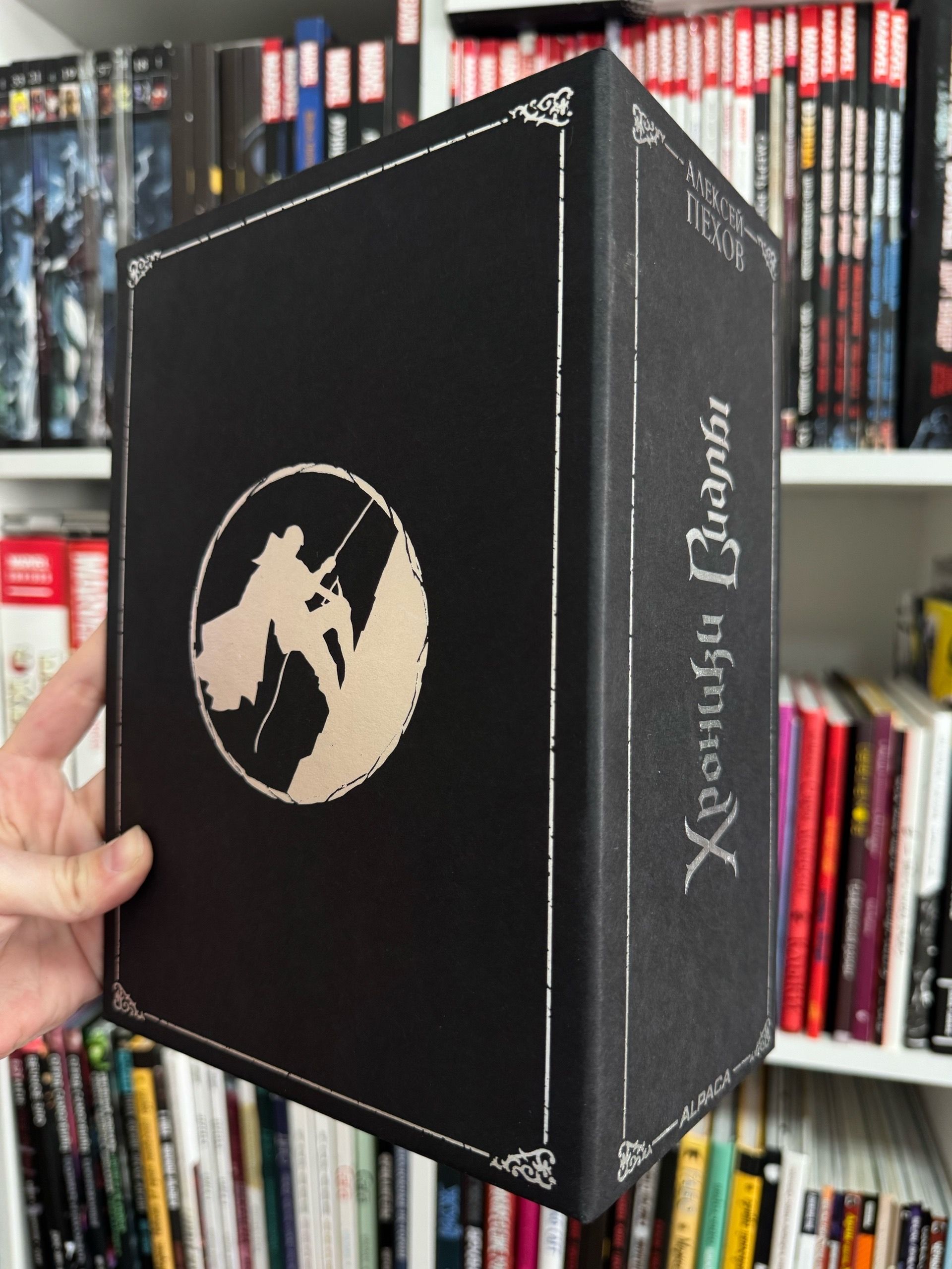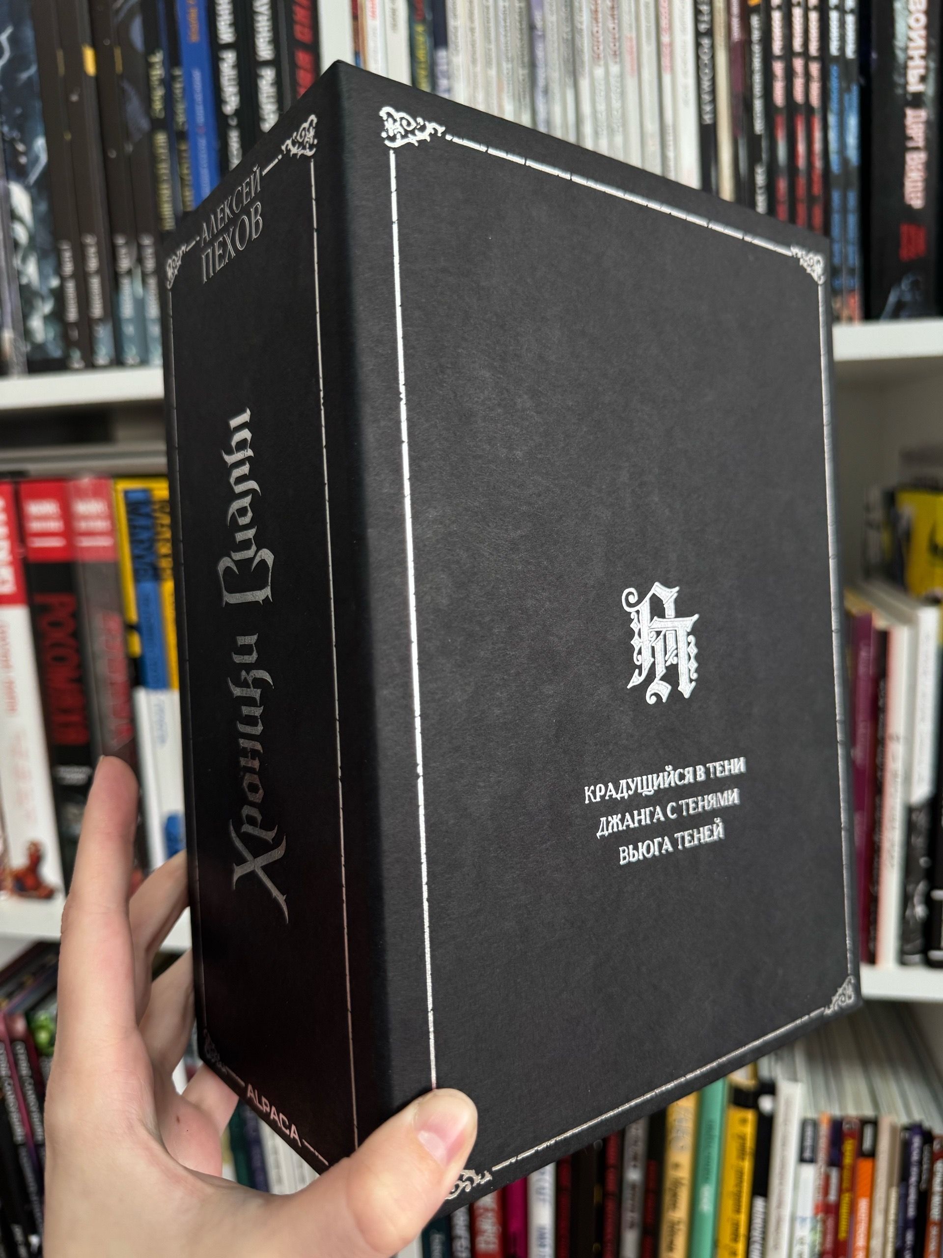 Слипкейс из плотного картона с чёрным закрасом и украшением серебряной фольгой, предназначенный для хранения трилогии Алексея Пехова «Хроники Сиалы»: «Крадущийся в тени», «Джанга с тенями» и «Вьюга теней». Книги не входят в стоимость.