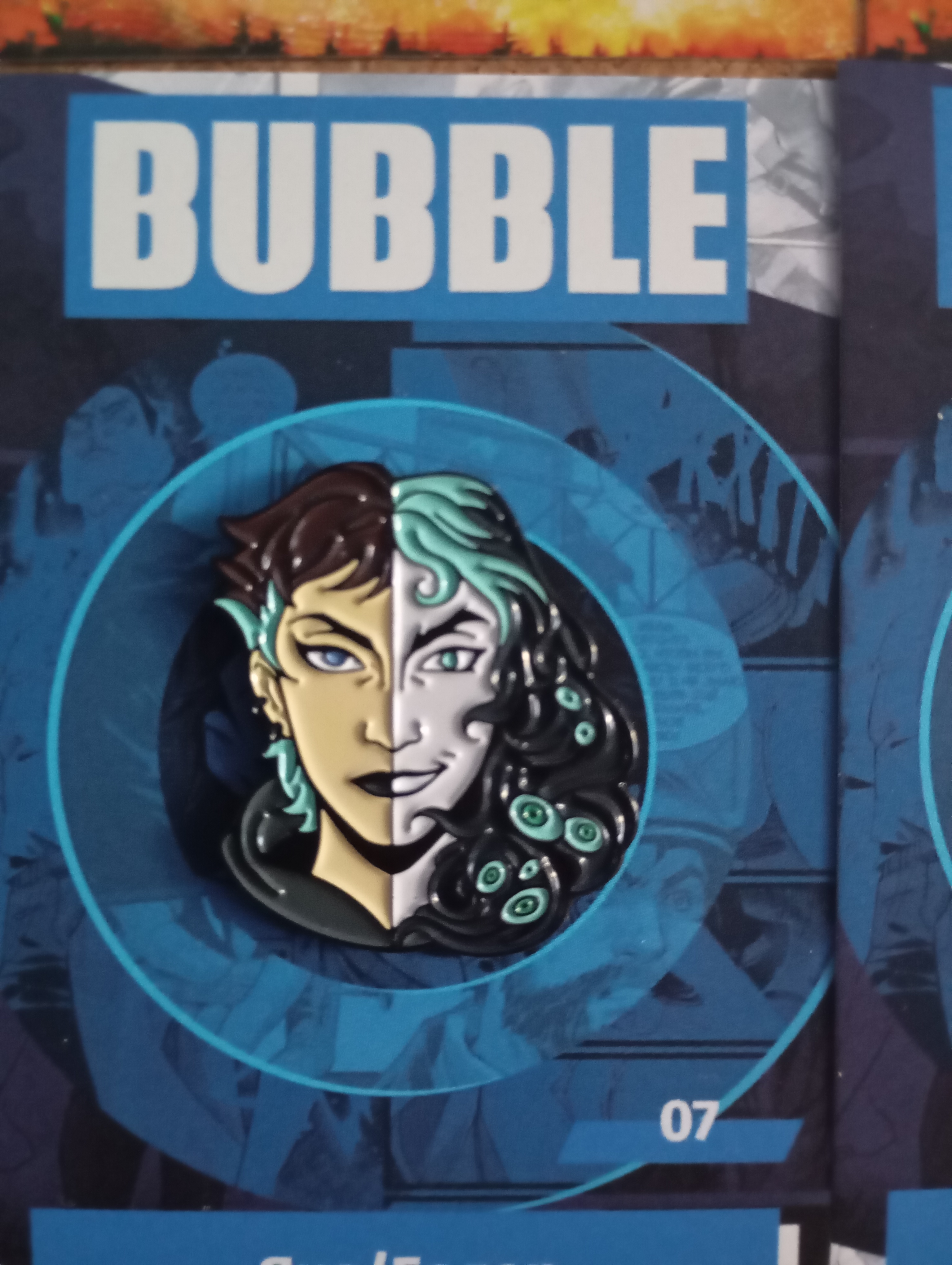 Металлический пин из серии по BUBBLE с Яной и Балором из серии Бесобой.