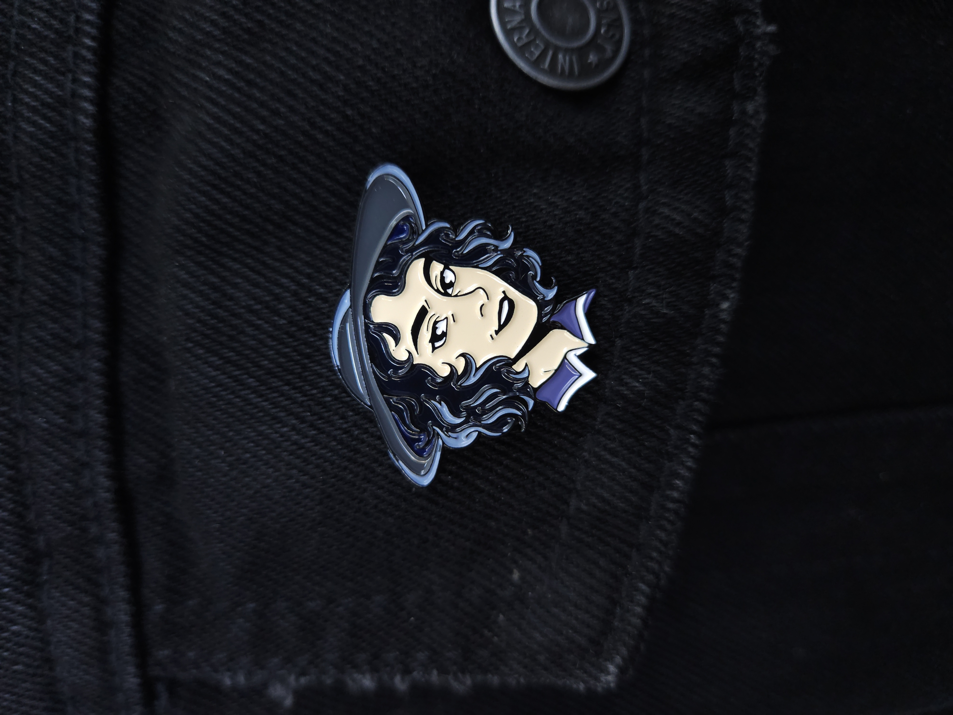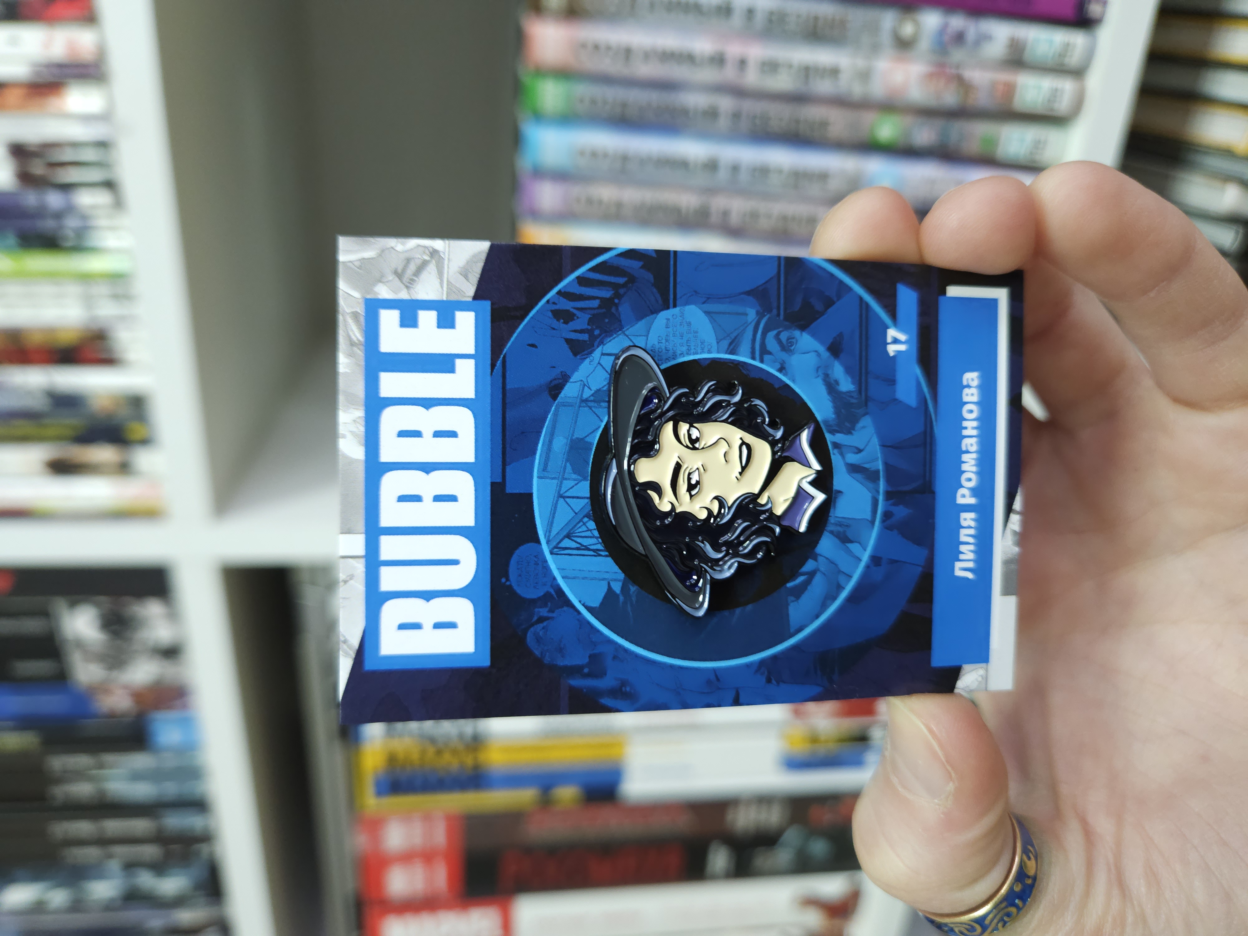 Металлический пин из серии по BUBBLE с книгочейкой Лилей Романовой из серии Экслибриум.