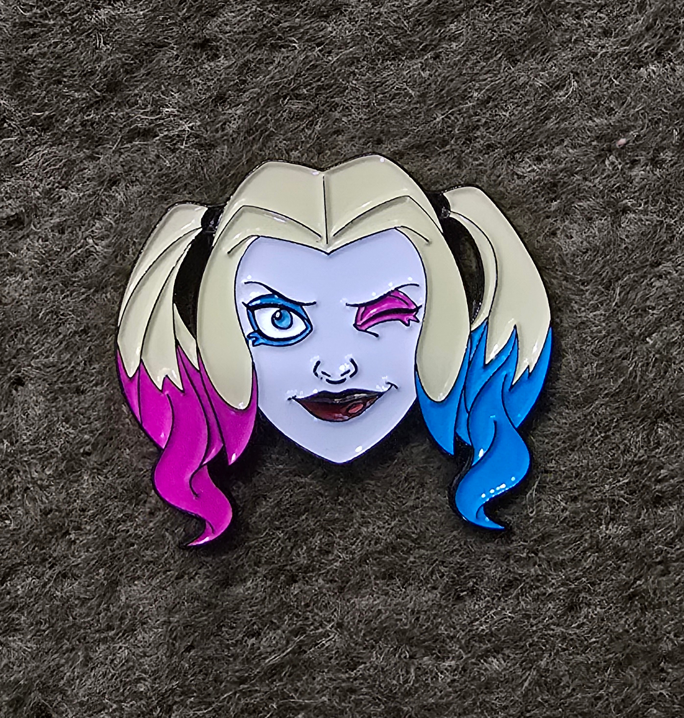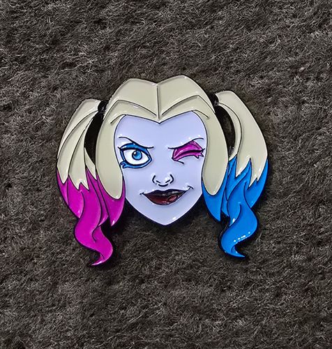 Пин из коллекции по мультсериалу "Харли Квинн" с Харли. Пин из мягкой эмали на картонной подложке с резиновыми застёжками + дополнительно металлическими - качество на высшем уровне.