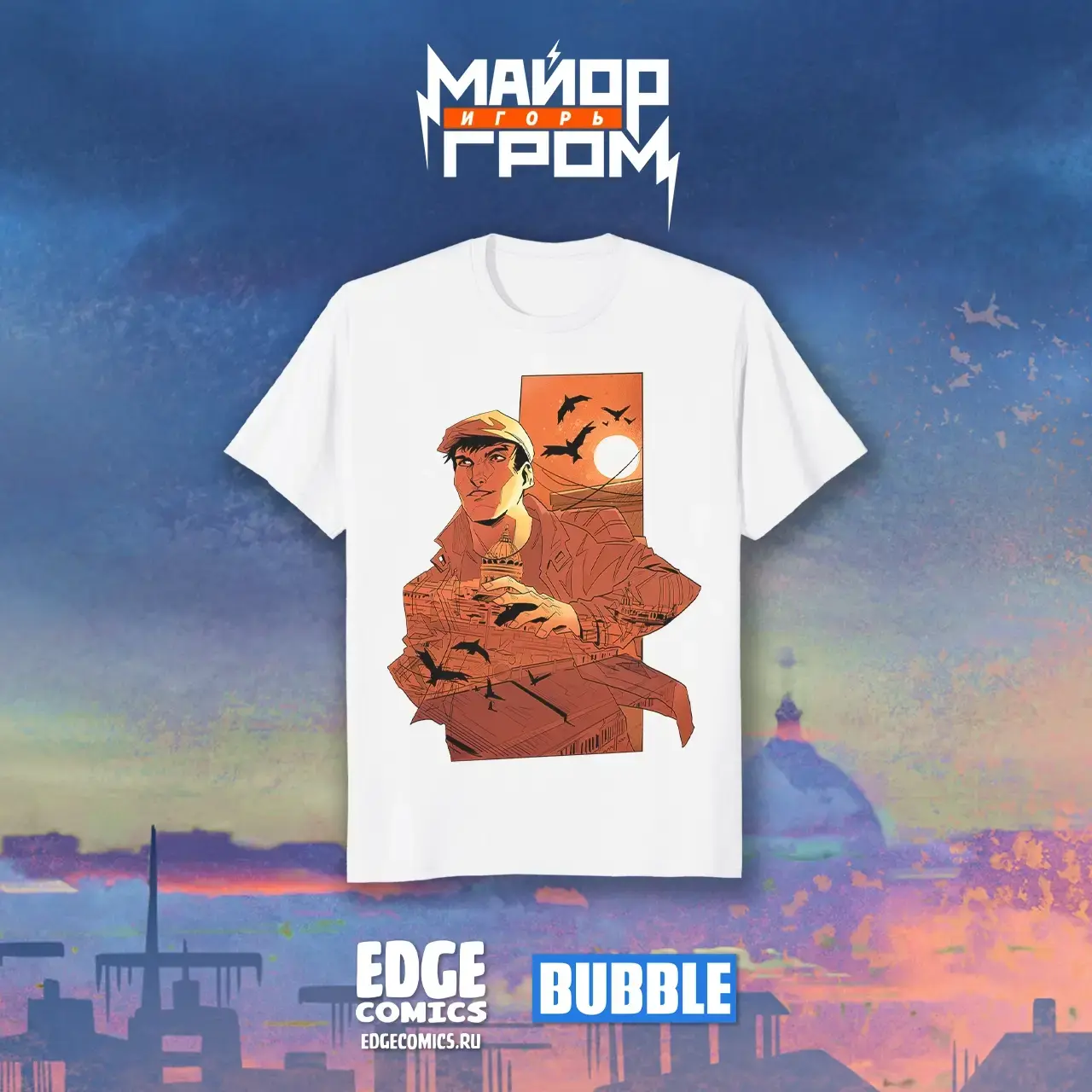 Футболка по серии "Майор Игорь Гром" с самим бравым Майором Громом на фоне его любимого города. Эксклюзивный белый вариант, доступен только в рамках крауда.