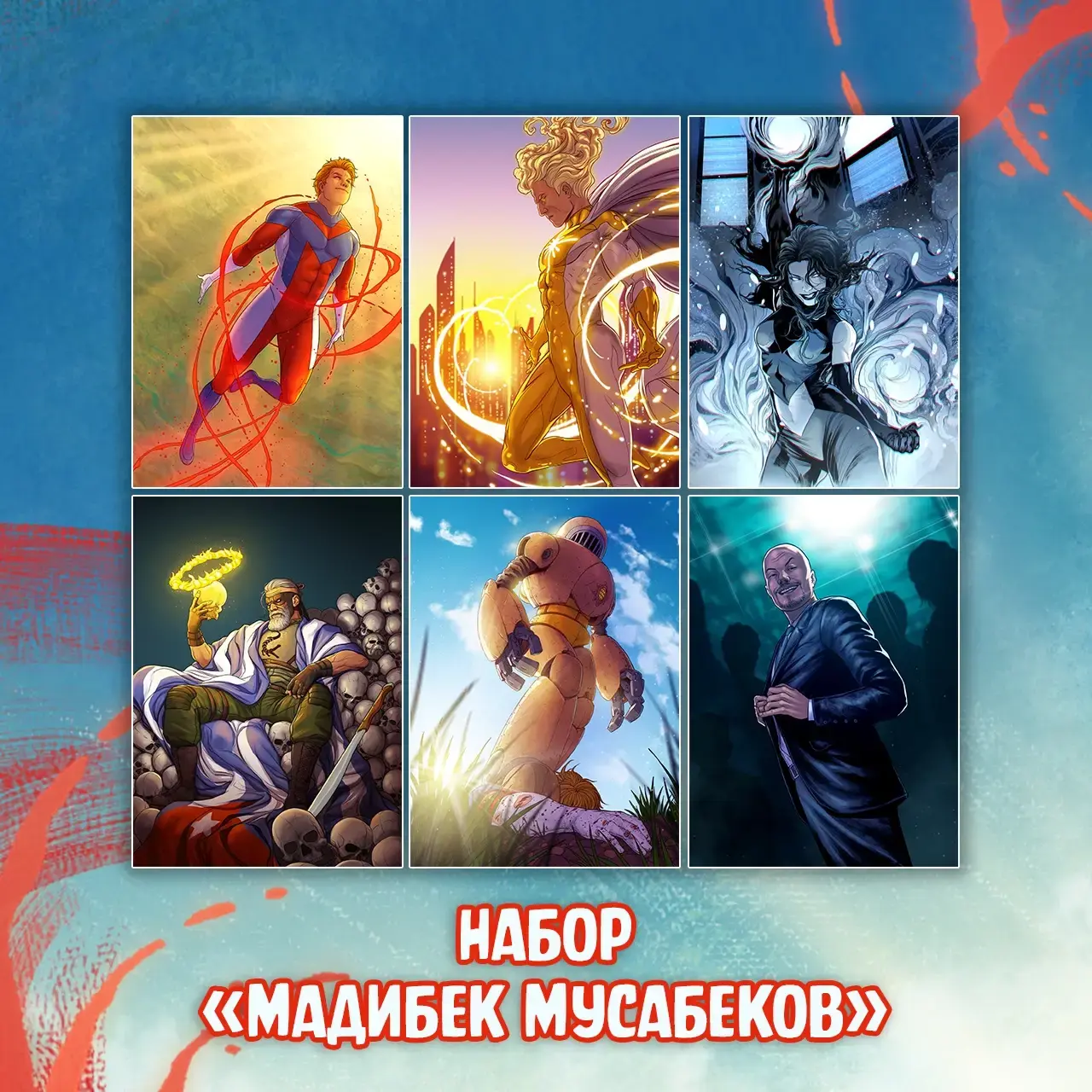 Над комиксом МИР трудилось множество талантливых художников, но именно эти трое сформировали его облик: запустивший серию эпичный Мадибек Мусабеков, пришедшая ему на смену талантливейшая Тая Макаревич, а также грандиозный Алексей Горбут, подаривший читателям легендарные вставки комикс-в-комиксе. Каждого из этих авторов мы отмечаем собственным набором открыток с любимейшими персонажами и культовыми моментами в их исполнении.