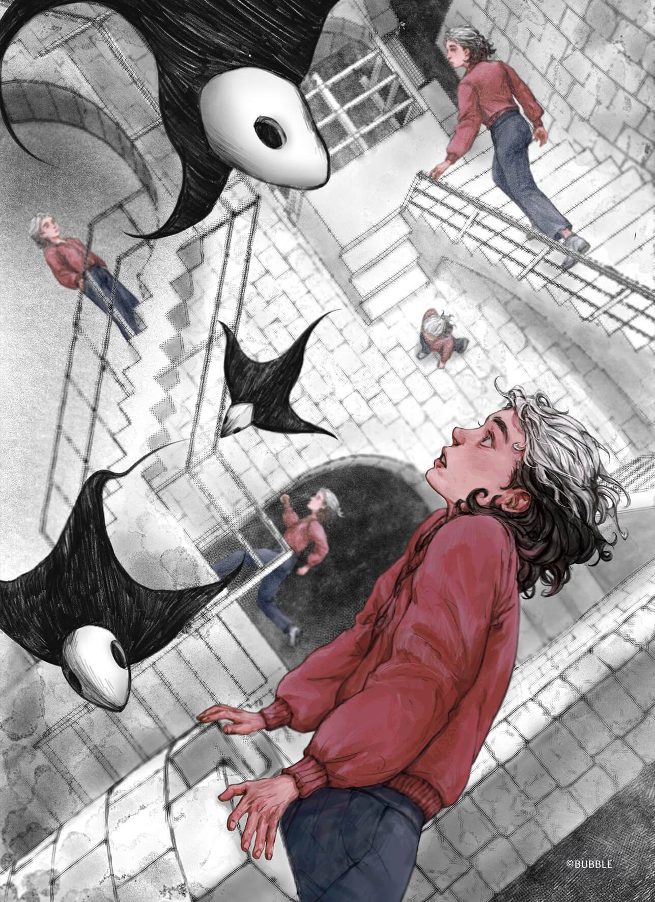 Атмосферная открытка по серии Экслибриум с Лилей Романовой и тенюшками, блуждающими в сюрреалистичных лиминальных пространствах.
