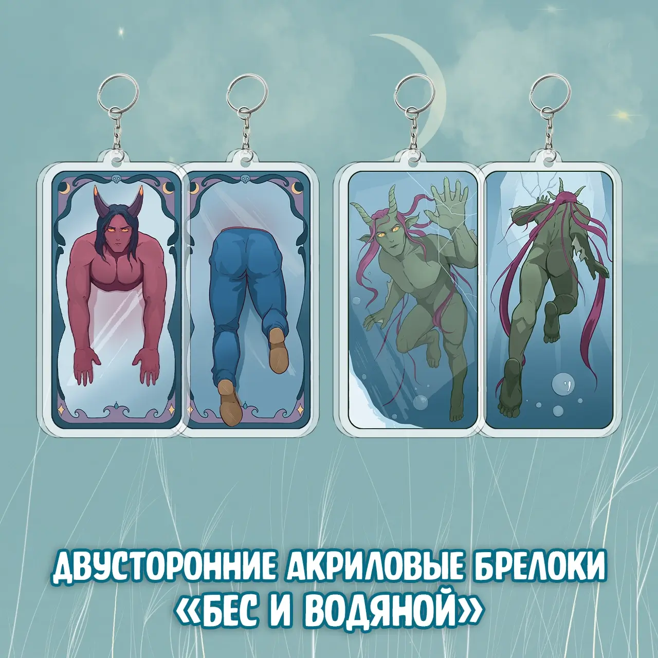 В этом вам помогут наши наборы брелоков и в первом из них незадачливый Бес снова попал в передрягу - на этот раз он застрял в нашем увеличенном (9см) двустороннем акриловом брелоке, а компанию ему составит покоритель дамских сердец Водяной.