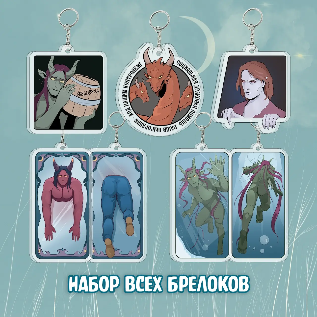Во втором наборе с обычными (5см) брелоками вы найдёте домового упыря Федю, Водяного с любимой медовухой и рекламу социальной драконьей помощи.