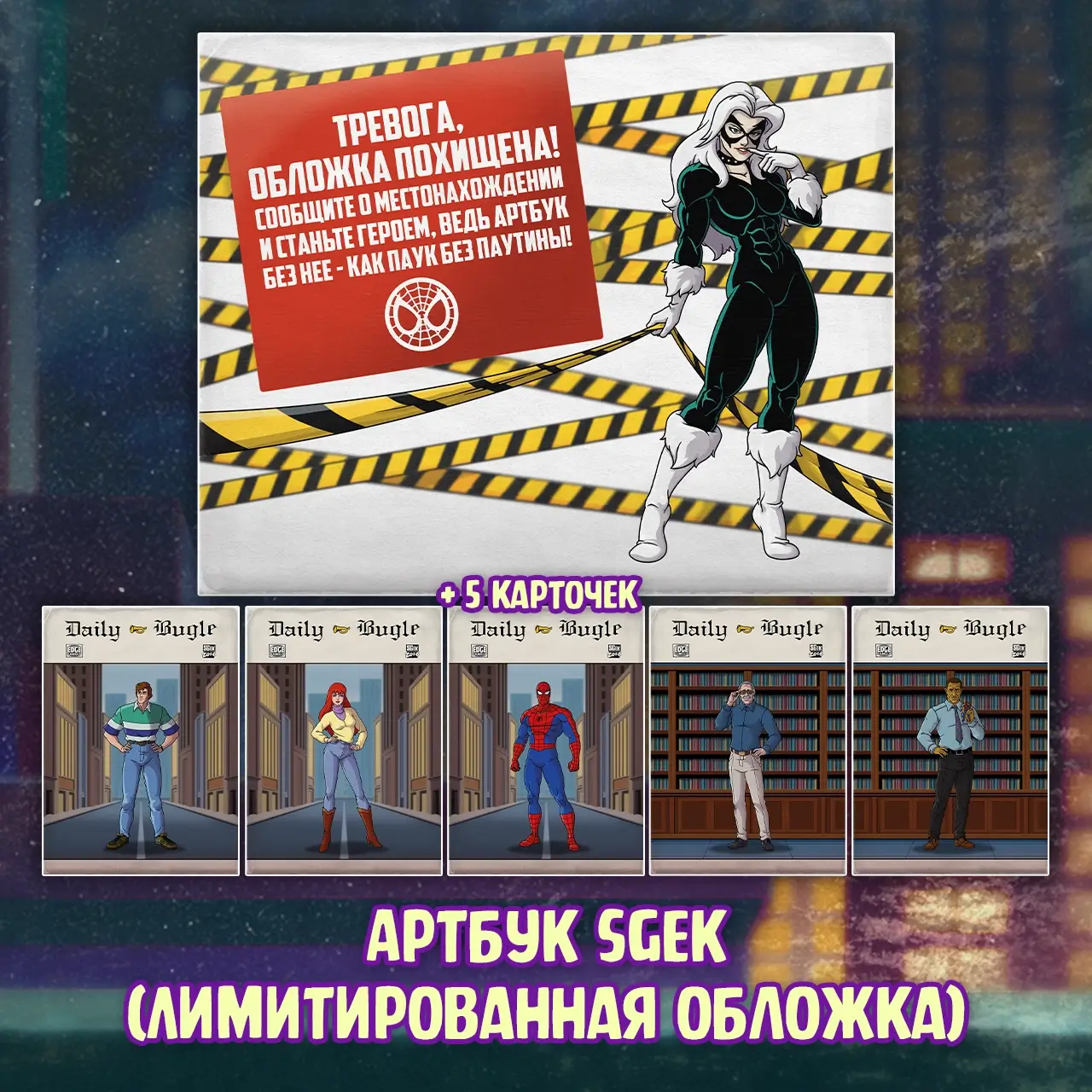 Внутри будут все 65 артов (по одной на серию), созданных дружелюбным паучьим художником SGek в коллаборации со студией озвучки "Студия 616", а так же несколько страниц с комментариями. Кстати, специально для артбука SGek переработает все арты — кое-где поправит цвета, а где-то и персонажа перерисует заново, в общем, освежит паучий сборник для давних поклонников и новичков. А вот пример изменений на лимитированной обложке: